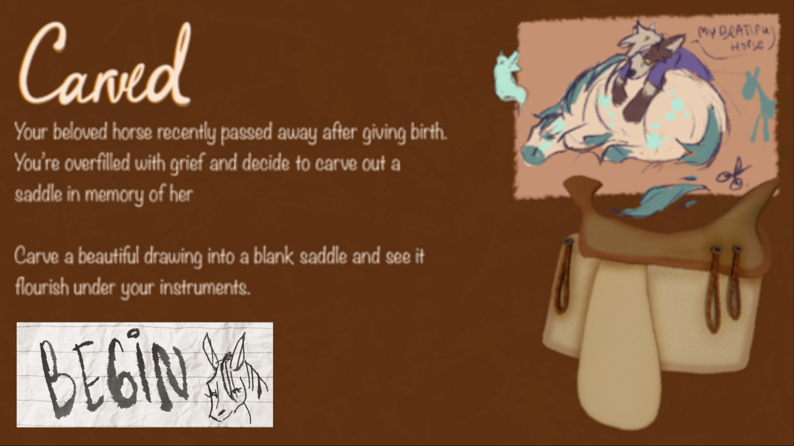 You, Caster J Rywoof, just lost your beloved childhood mare as she was foaling. An unfortunate situation pushed you to create something beautiful to remember her better.